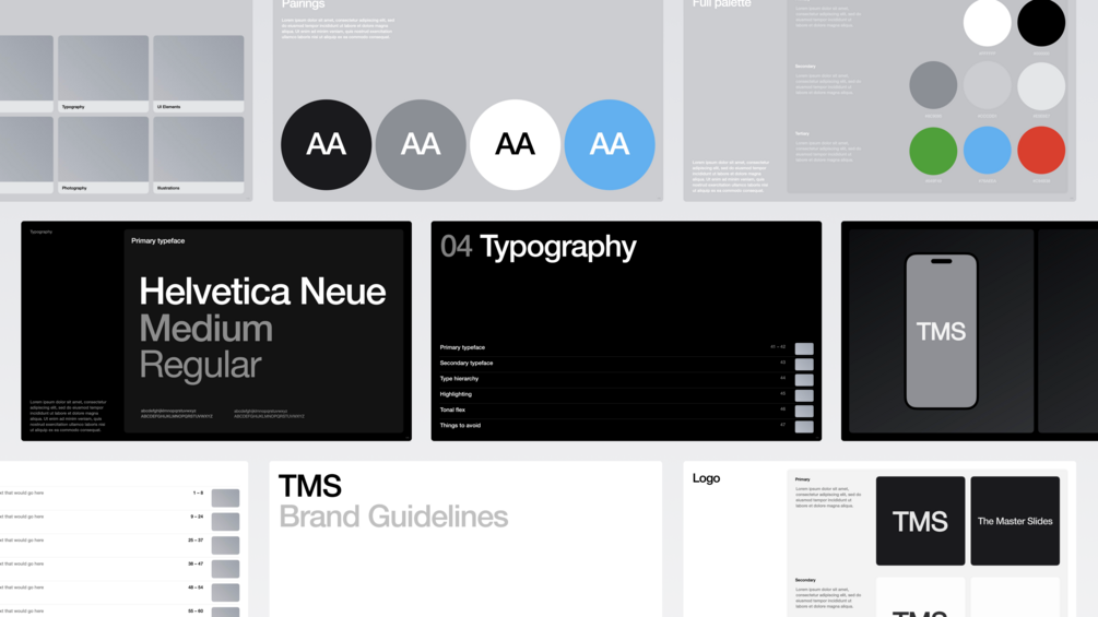 TMS Brand Guidelines is a clean, practical template built to help you define and share your brand with clarity. Whether you're starting a new brand or organizing an existing one, this template gives you a simple way to bring it all together. It includes ready-made slides for each part of your brand – logos, colors, typography, tone of voice, and imagery – so you can quickly put together a solid brand book or share guidelines with your team or partners. With 71 unique layouts available in light, dark, and grey, TMS Brand Guidelines offers a total of 213 slides.